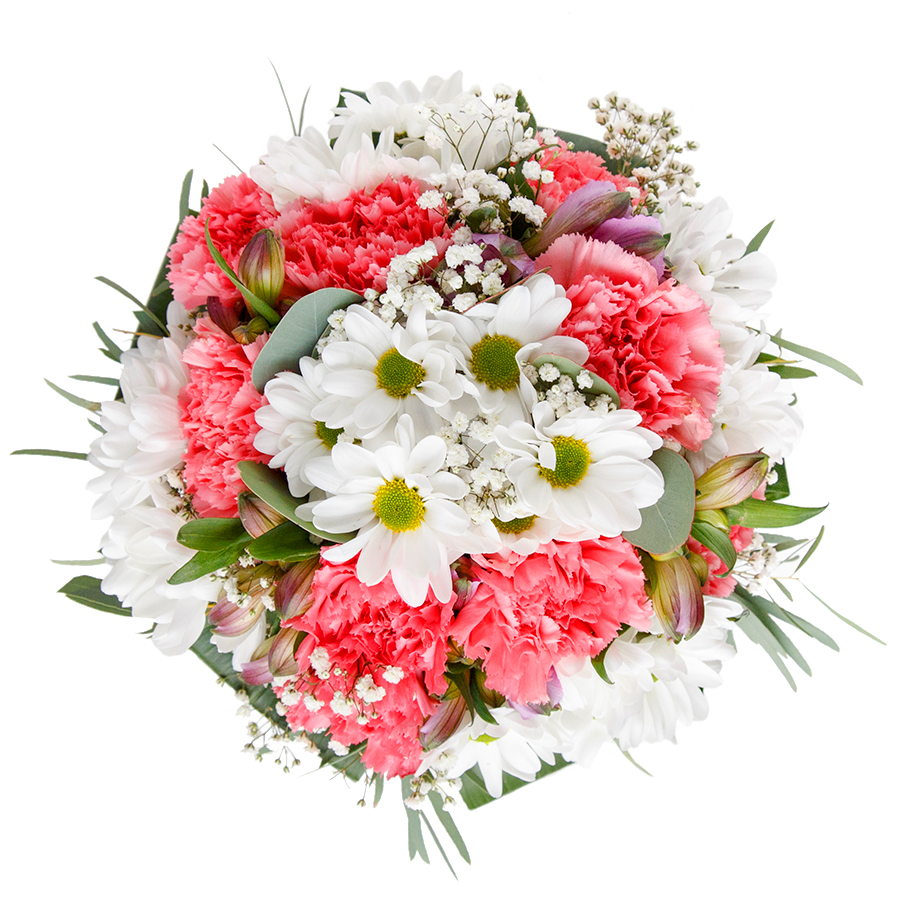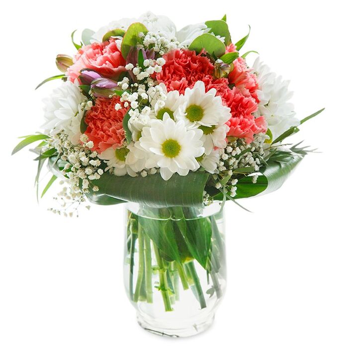 Delight someone special with our beautifully crafted flower arrangement. This unique bouquet features a harmonious blend of snow-white chrysanthemums, delicate gypsophila, soft light pink carnations, and lush aspidistra leaves.